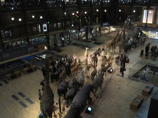 Friday- Somehow (I don't know how) we made it out of the house by 11 and walked the ten minutes to the zoo to meet our friend Paz, an PhD student who works at the Quai Branly museum, and her two little boys Lucas and Martin. Unfortunately, the two inches of snow a couple of days ago led to the zoo being closed (a shame- it's a great zoo and also the oldest zoo in Europe). However, the Musee d'Histoire Naturelle next door was open so we went in there instead. The natural history museum made quite a stir when it was opened a few years back, since it was in a historic building from the late 1800s that was converted into building displaying information on animal life, ecology and a wonderful ancient high-ceilinged room room filled with stuffed extinct or endangered animals- and oddly enough, also a huge clock that belonged to Marie Antoinette. We loved the museum, all got very sad in the endangered animal room, had a fun picnic in the cafeteria, spent a long time looking at butterflies and bugs, explored the amazing dinosaur exhibit... and we only lost Paz's son once!