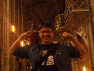 The other thing that got us was the beautiful anti-protestant wooden carving behind the altar. Prague had an important yet unsuccessful role in the Protestant Reformation. Prague had its own Martin Luther: Priest Jan Hus, who preached to the public about Catholic abuses and how the church should not be allowed to take up arms. Unfortunately, Jan Hus did not have the printing press behind him to sell his story to the masses and he was imprisoned and later burned at the stake, which inspired the Hussite wars (where followers of Jan Hus were both attacked and turned-revolutionary, anti-Austro Hungarian empire). His thoughts and actions are widely thought to have contributed to Martin Luther's teachings. Interestingly, the Catholic St. Vitus Cathedral still looms over Prague, yet the Czech Republic is 90% protestant, primarily following the spirit and teachings of Jan Hus. And the wooden carving that we studied is basically anti-Hussite/ Protestant propaganda, showing the looting of the church by Protestant 'hooligans'.